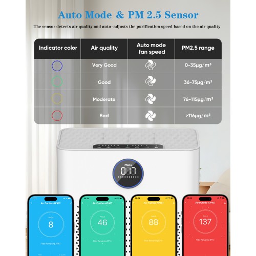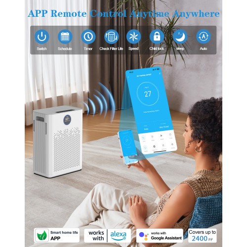 Air Purifier for Large Rooms up to 2400 Sq.ft,Smart WIFi HEPA Air Purifiers with and Washable Pre-Filter for Wildfire,Pollen, Dust, Pet Fur & Odor, AP407, White+Gray